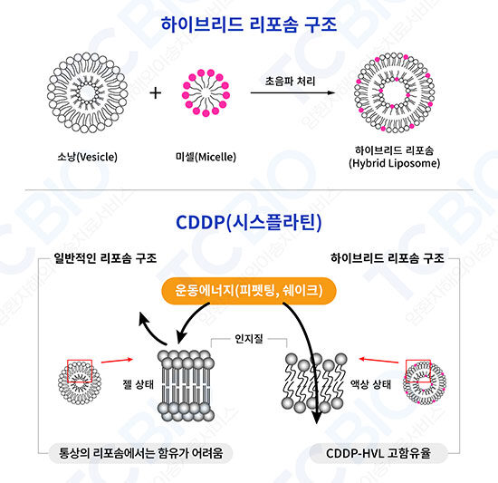 리포솜은 지질 이중층을 가진 원형의 소포이며 영양소나 의약품 수송수단으로 이용되는데 소포(Vesicle)와 Micelle을 초음파 처리 특수가공 하여 약제의 수송성과 함유성을 높여 하이브리드 리포솜(Hybrid Liposome/HVL)을 만들어 여기에 시스플라틴을 결합하여(CDDP-HVL) 체내에 정맥 투여를 한다.