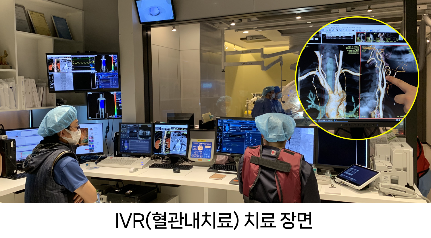 이 복합치료 중에 핵심적인 IVR(TACE)치료는 일반적인 표준치료(수술, 방사선, 항암)치료가 어려운 암과 뼈 전이, 복막전이 등에서도 많은 효과를 보고 있다고 한다. 서혜부 동맥에 부분마취 후, micro 카테터를 삽입시켜 혈관을 따라 종양내부에 항암제나 유전자를 직접 넣어 사멸하는 방법이다. 부작용도 거의 없고 효과는 매우 놀라울 정도로 상당하다고 한다. 시술 시간은 1시간 30분~2시간 정도 소요된다.